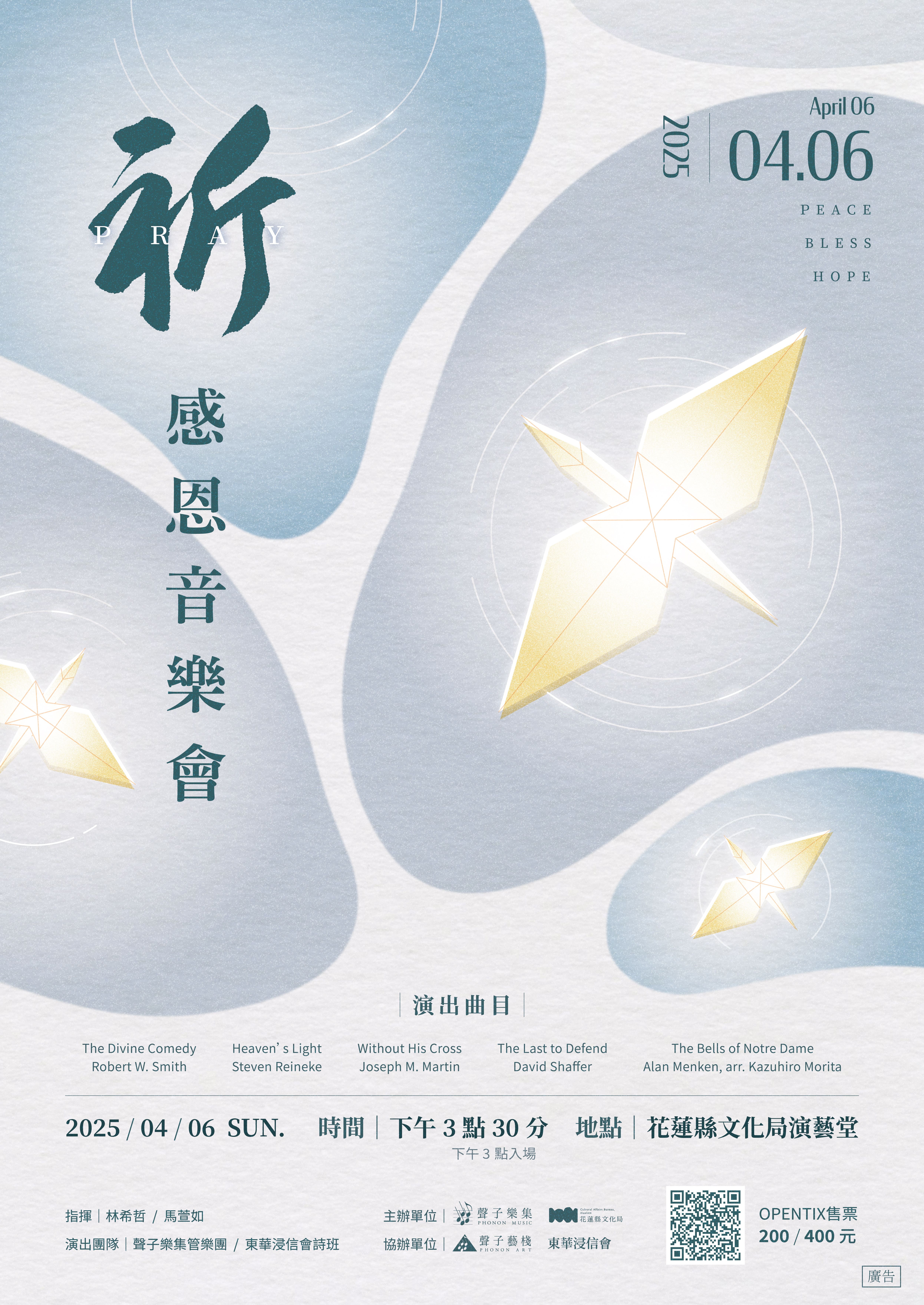 2024 一年下來,烏俄戰爭仍看不到盡頭、以巴衝突還沒解決又加入了敘利亞的變數,中國則是各種對台灣的文攻武嚇,整個世界充斥不平安的感受,在這個時刻,身為音樂家的我們,總想為這塊土地的人們做點什麼,於是,這場音樂會「祈」,就在這樣的時空背景下醞釀出來,一場以祈禱、祝福、感恩為出發點的音樂會,希望帶個身旁的人們一些平安,同時也為聲子走過 1/4 世紀,當中所受到的許多鼓勵、幫助,我們想透過音樂感謝這二十五年來支持聲子經歷高峰低谷的朋友。